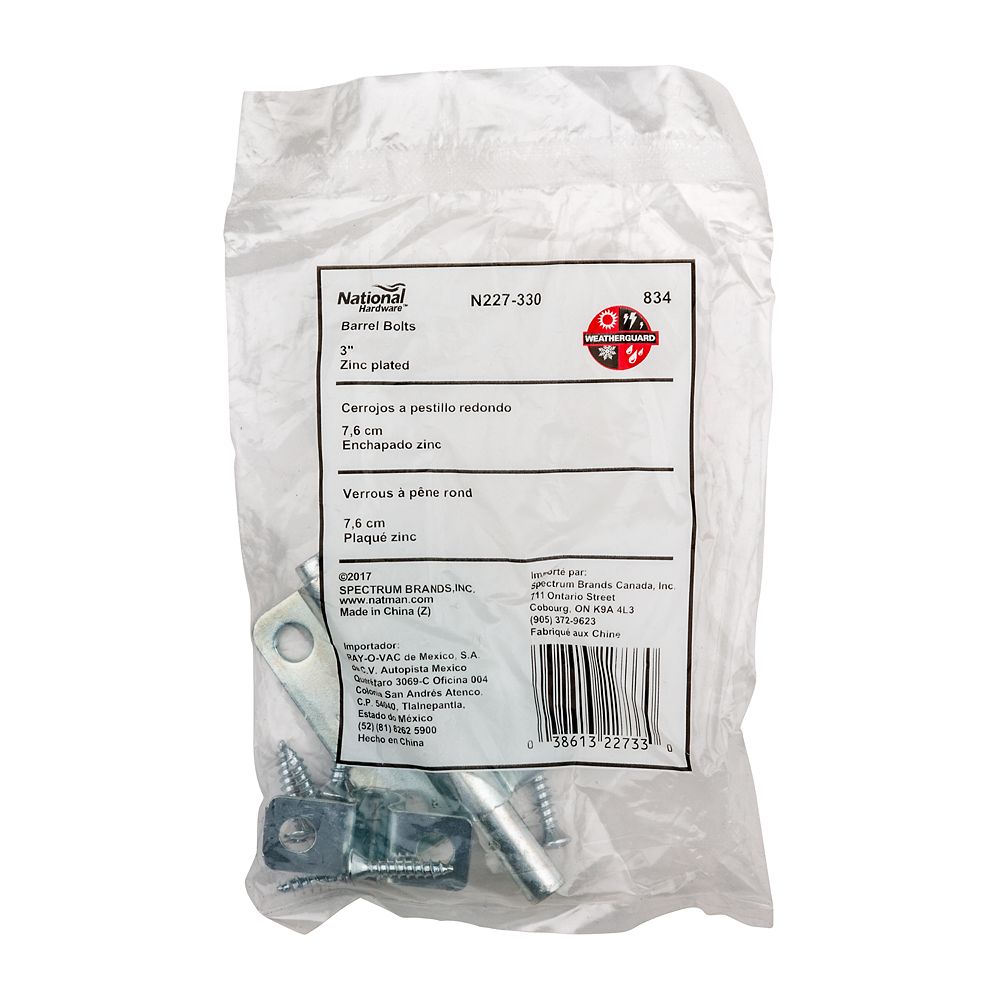 • National Hardware's 3" Zinc-Plated Barrel Bolt is designed for security applications on lightweight doors, chests, and cabinets.